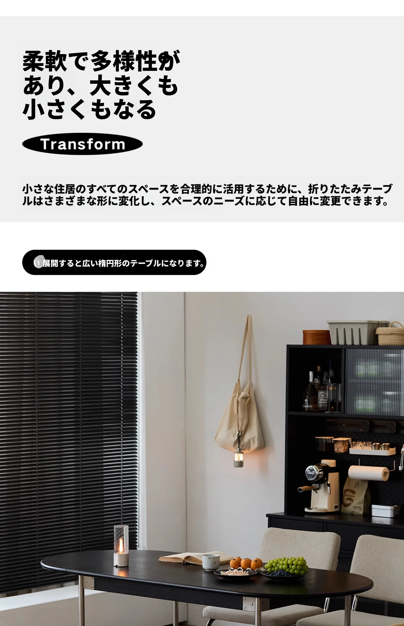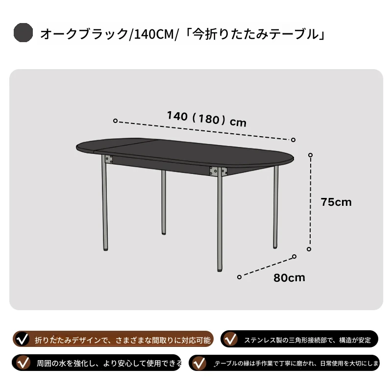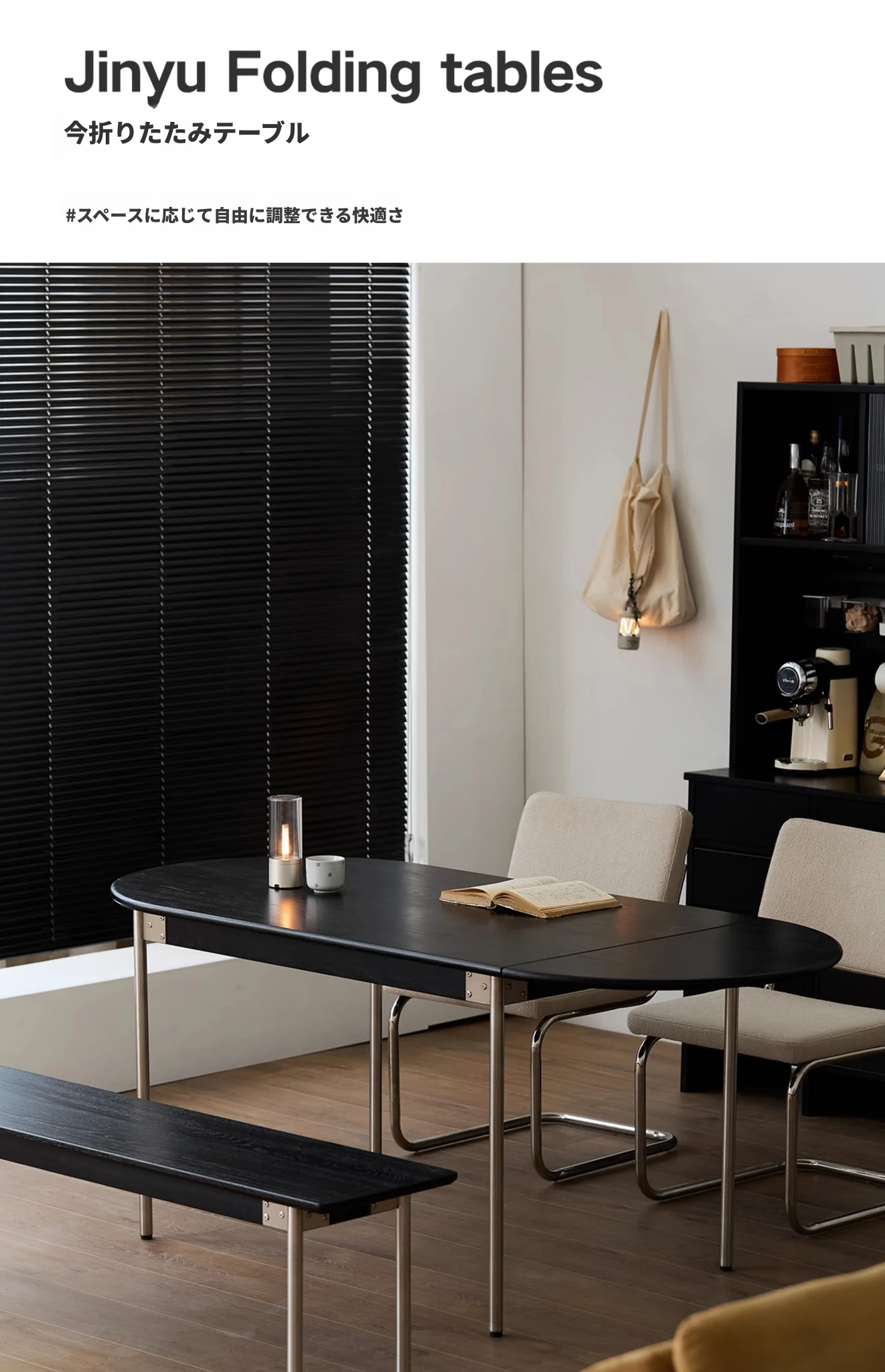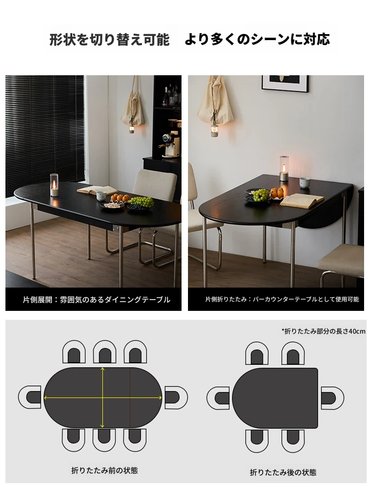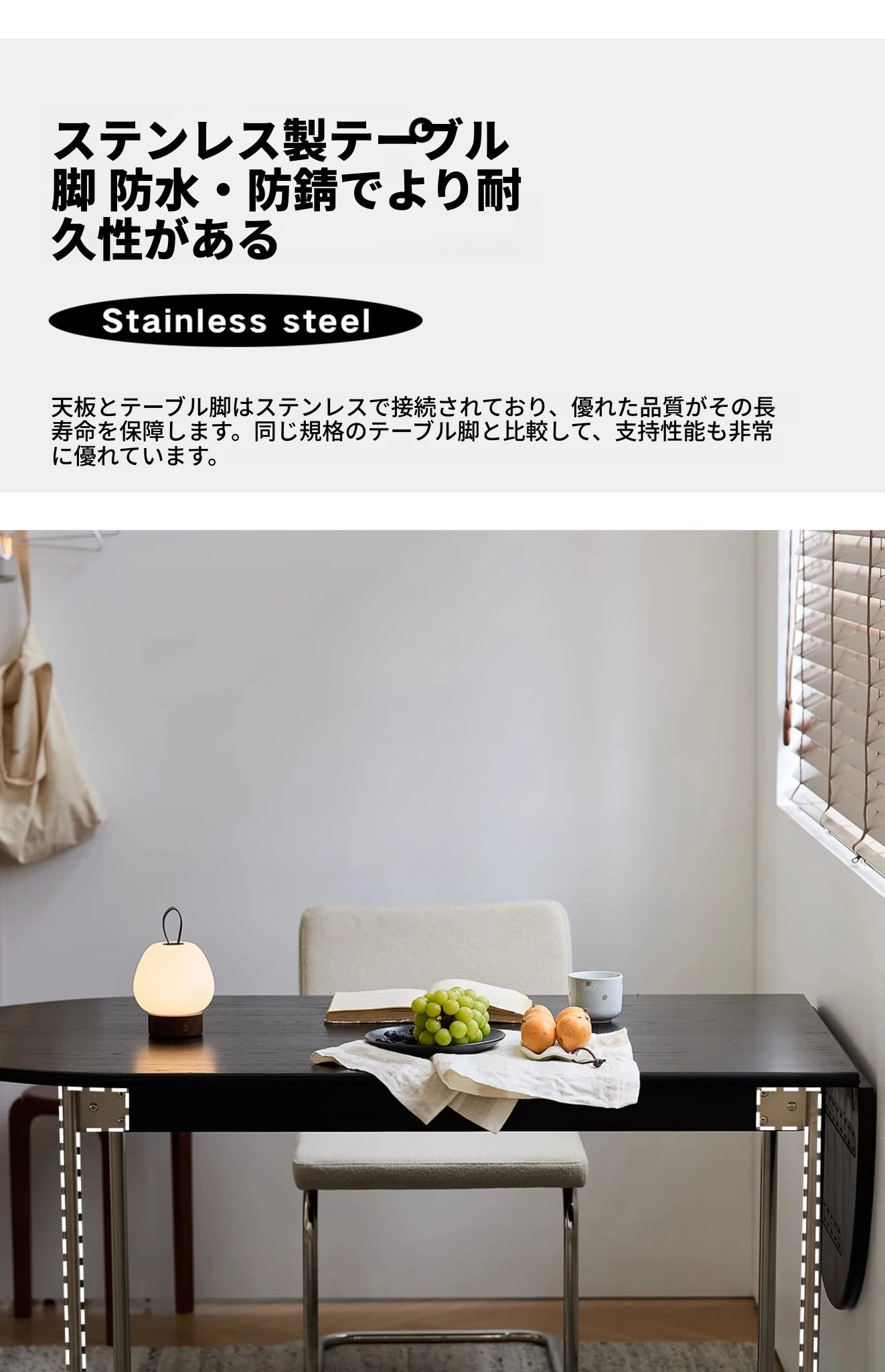 北欧風全木製エレガントな楕円形・半円形折りたたみテーブル - オーク材使用、小スペースに最適な伸縮式ダイニングテーブル&チェアセット!シンプルなデザインでおしゃれな食卓を演出。