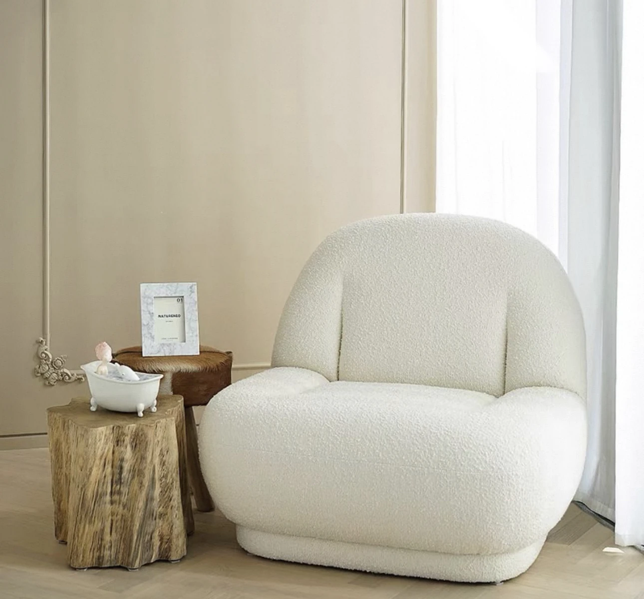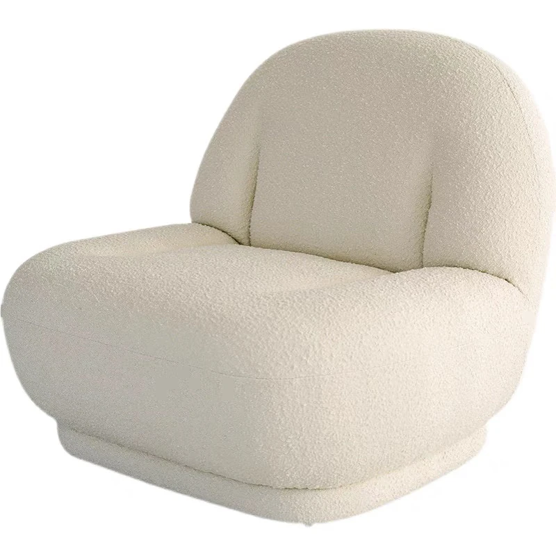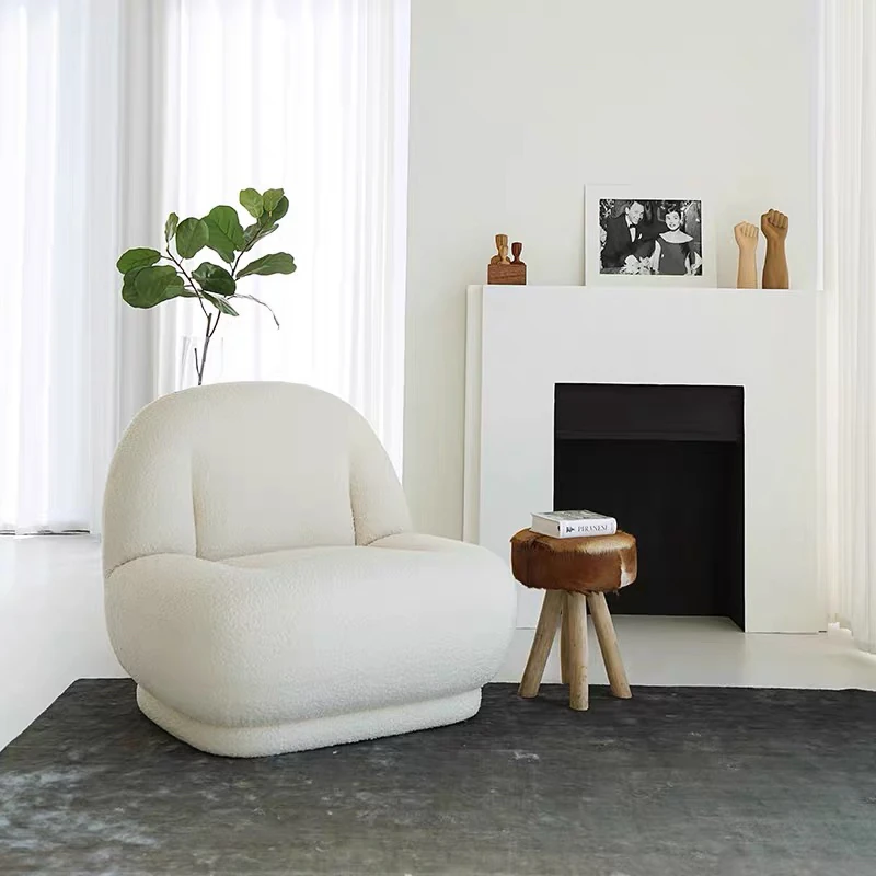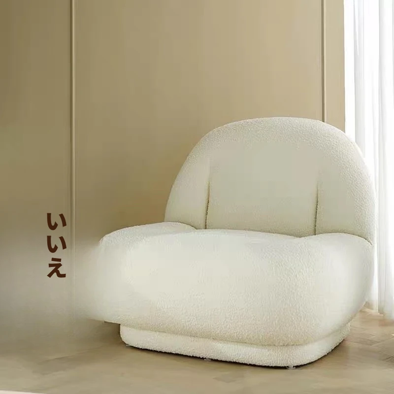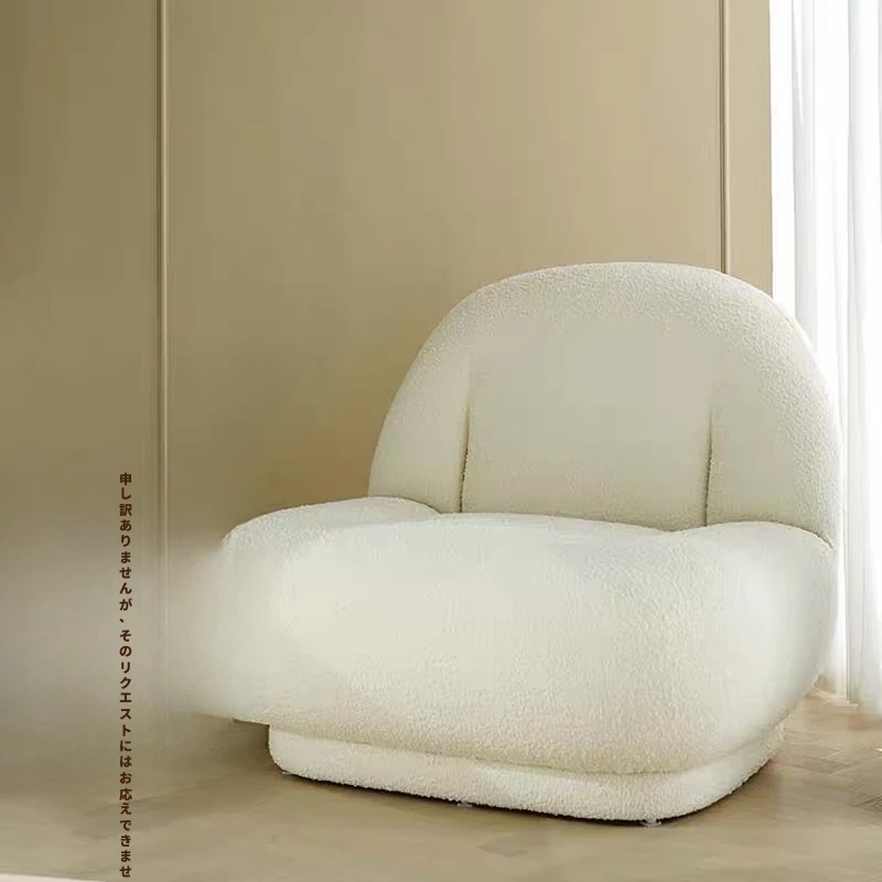 インフルエンサー推薦!モダンでクリエイティブなホワイトラムフリースバルコニー用シンプル一人用リラックスチェア、デザイナーのふわふわソファでくつろぎの時間を楽しもう!