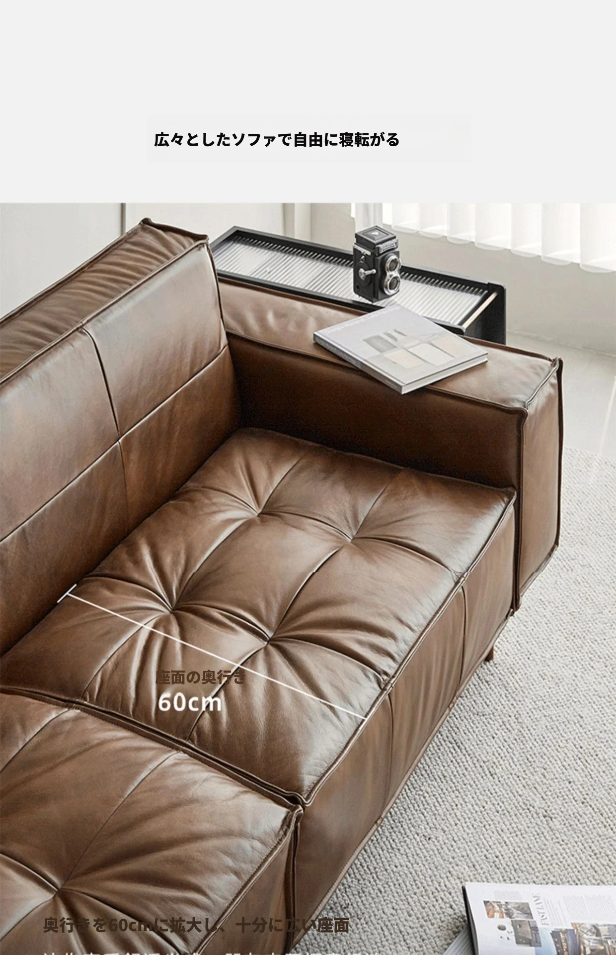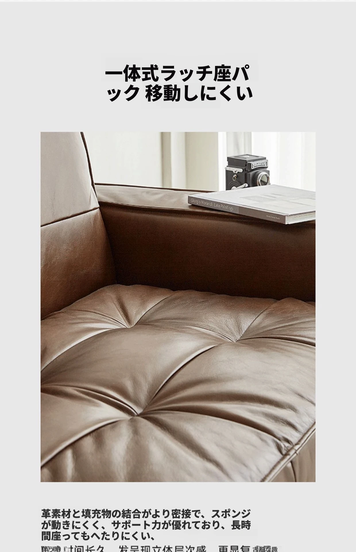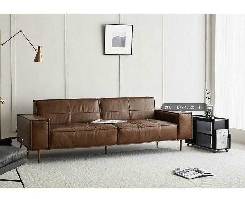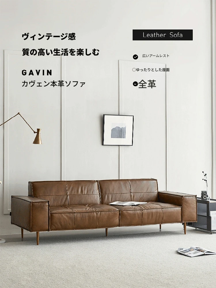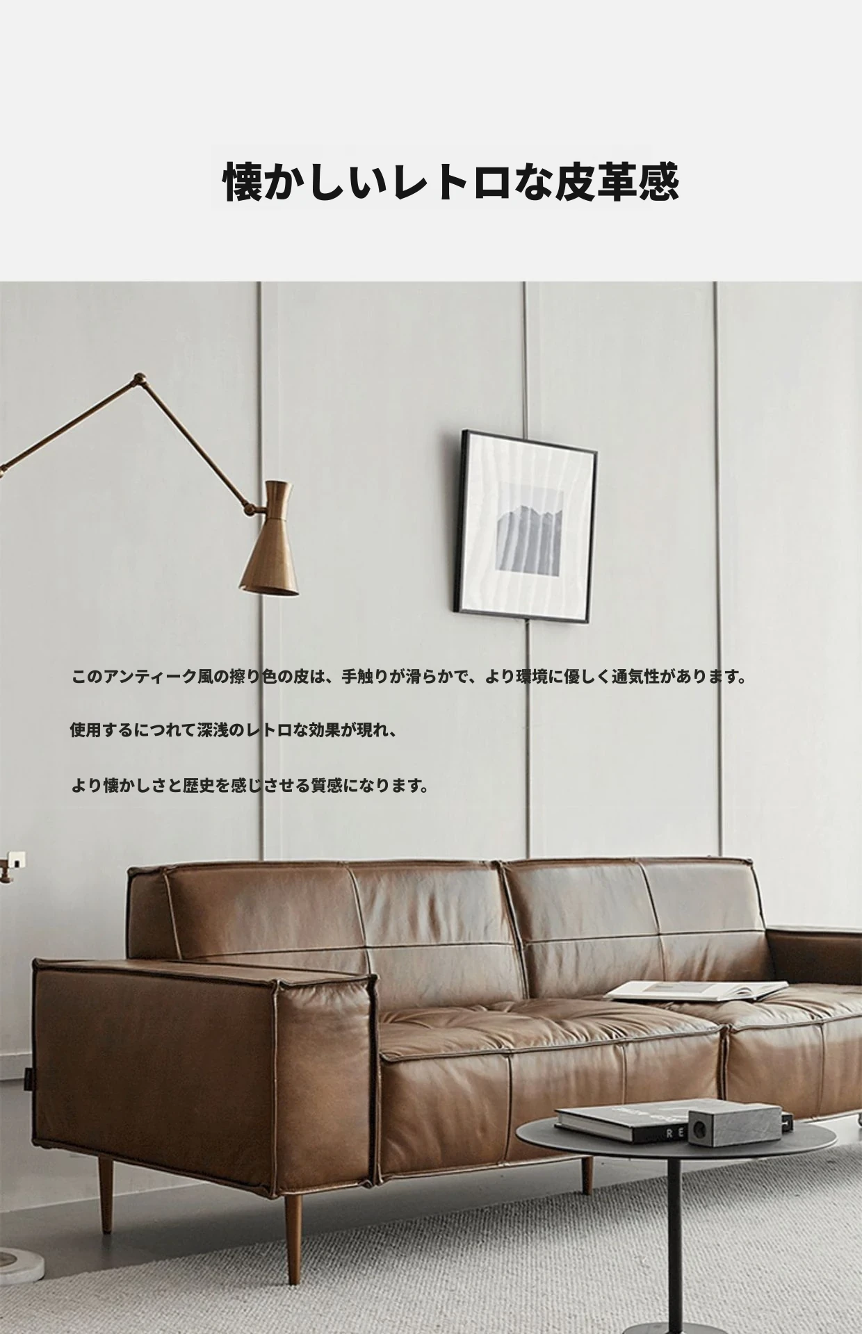 中古クラシックレトロ風の本革ソファー、小型リビングに最適!上質なトップグレイン牛革を使用したアメリカンスタイルのトーフブロック3人掛けソファーで、心地よいくつろぎの空間を演出します。