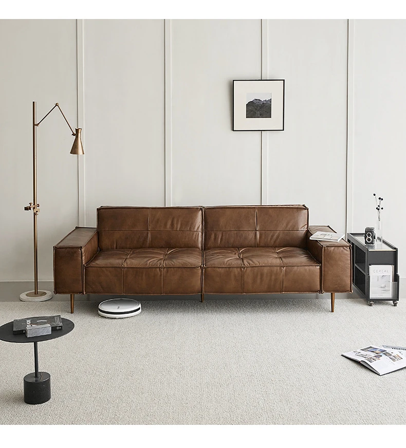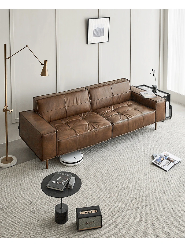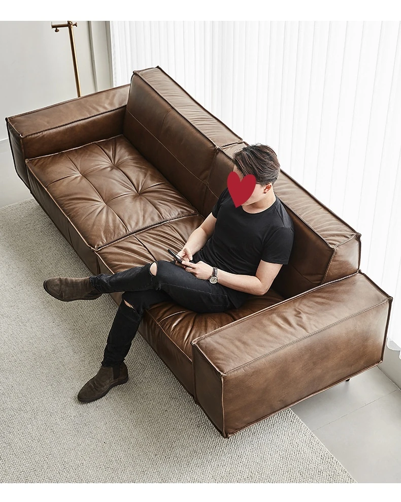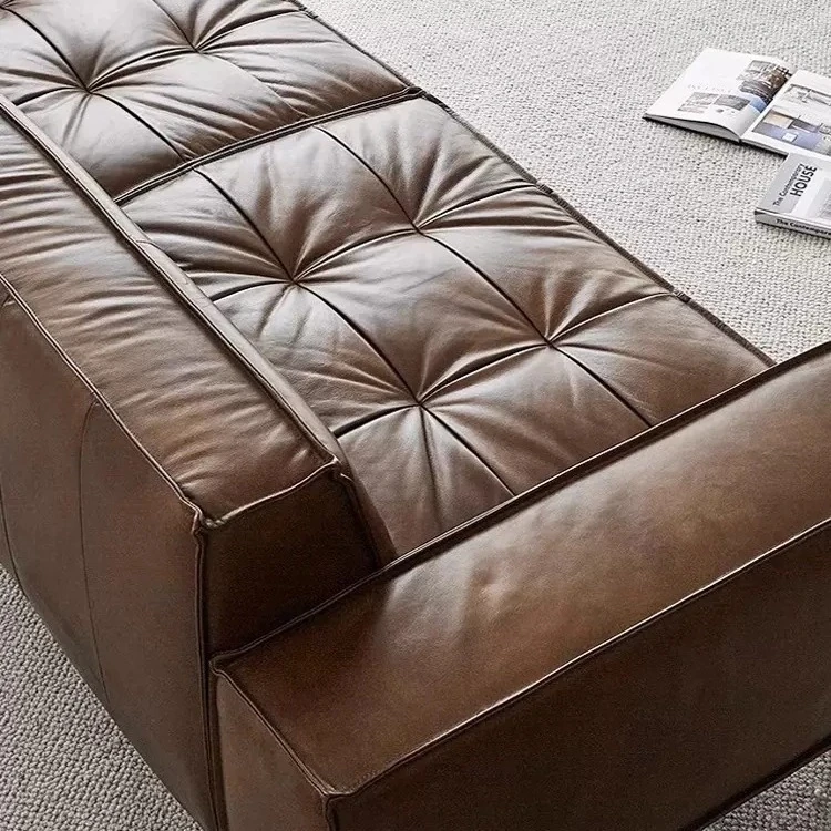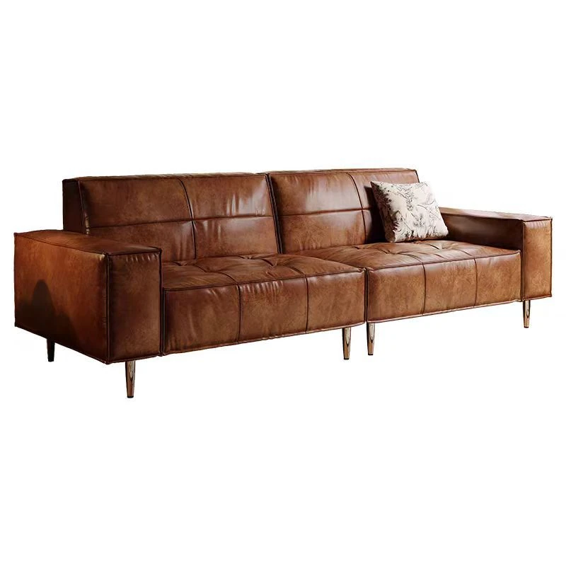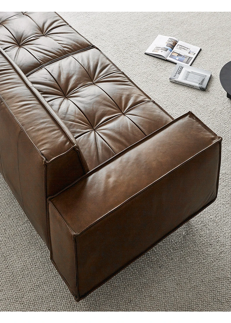 中古クラシックレトロ風の本革ソファー、小型リビングに最適!上質なトップグレイン牛革を使用したアメリカンスタイルのトーフブロック3人掛けソファーで、心地よいくつろぎの空間を演出します。