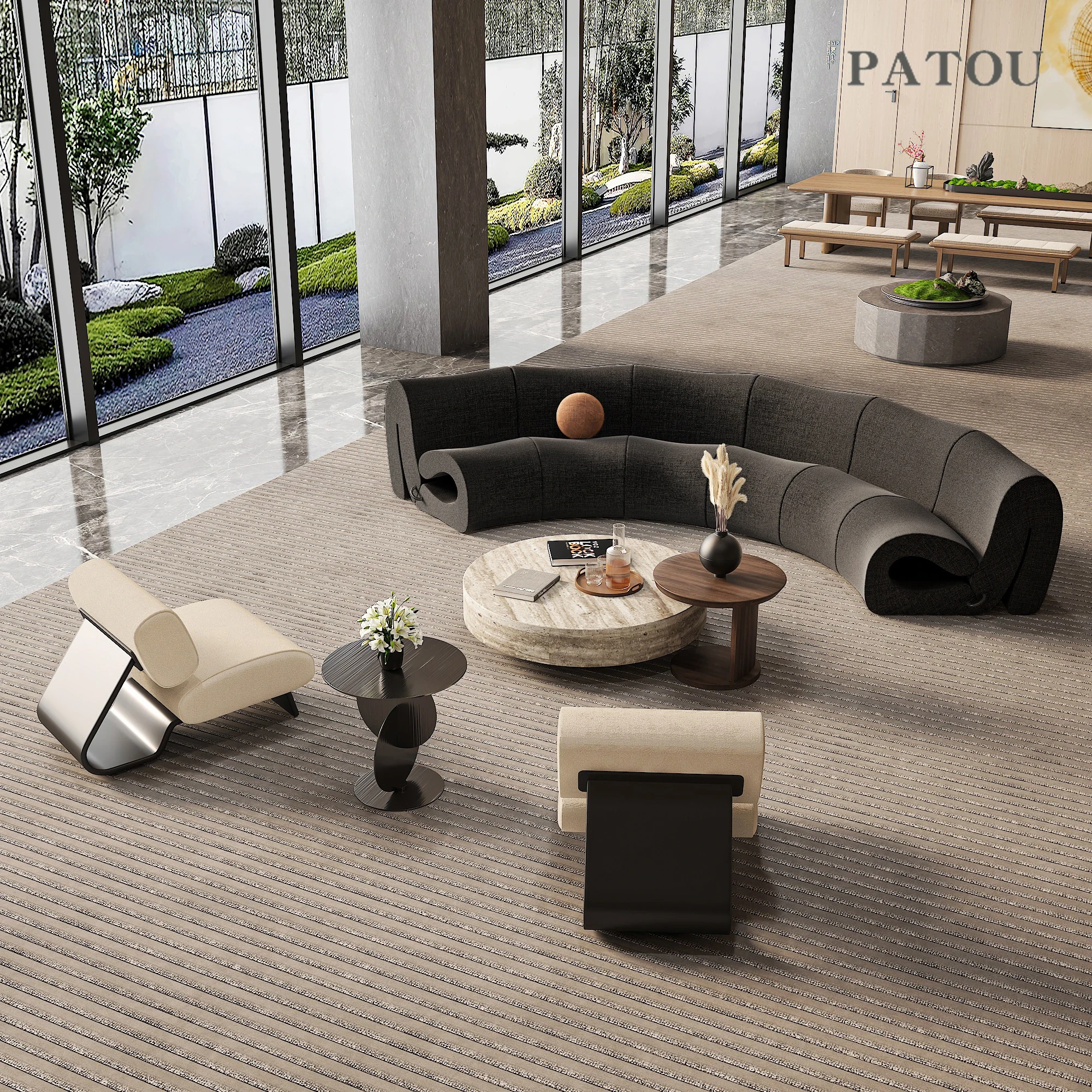 ホテルロビー用波紋デザインソファ|ユニークな形状で、民宿や美容院、医療美容クリニックの受付にも最適!優雅で快適な空間を演出する布製アーチ型ソファ。