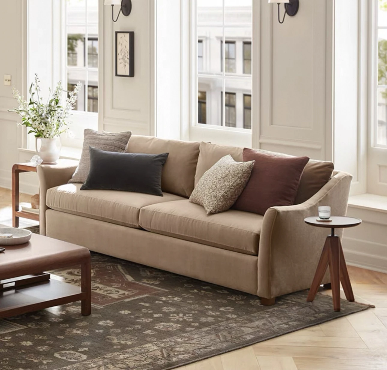 ヴィンテージスタイルの無垢材リビングソファ - アメリカンシンプルデザイン、3人掛け布製ソファ、小型スペースに最適なレトロストレートソファ!おしゃれで居心地の良い空間を演出します。