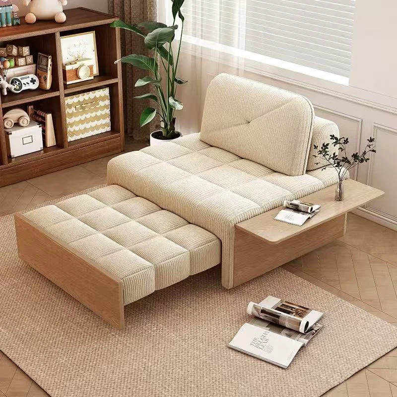 天然木材風の折りたたみソファベッド、コンパクトなリビングに最適!折りたたみ式テーブル付きで多機能、伸縮自在。小さなスペースでも快適な居住空間を実現します。