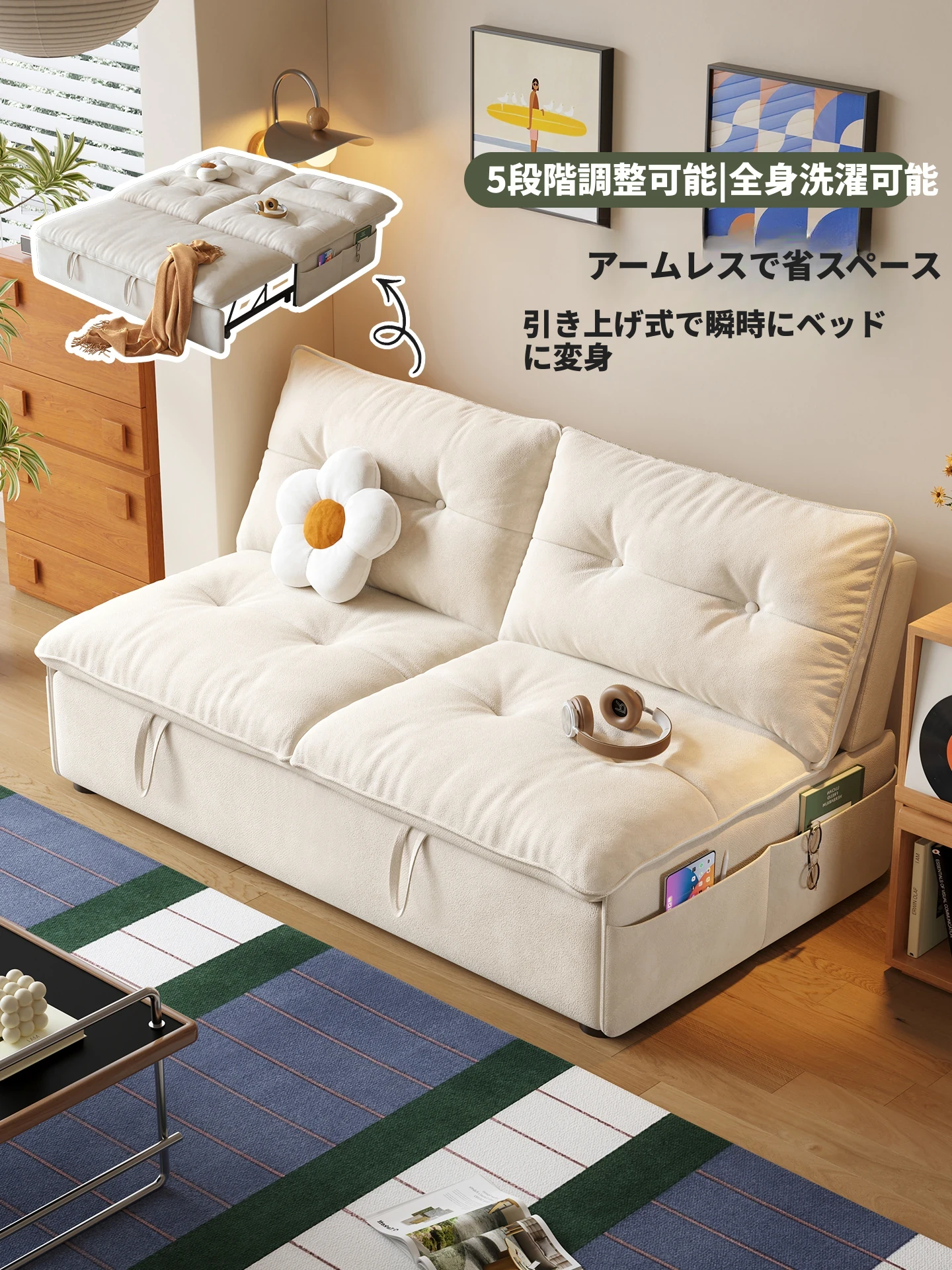木宮工房 ダブルソファベッド 折りたたみ式 2025年新作 クリームカラーの小型布製ソファ 収納機能付き おしゃれで機能的な空間を演出!