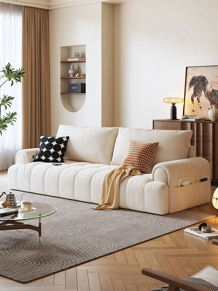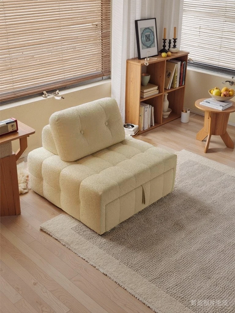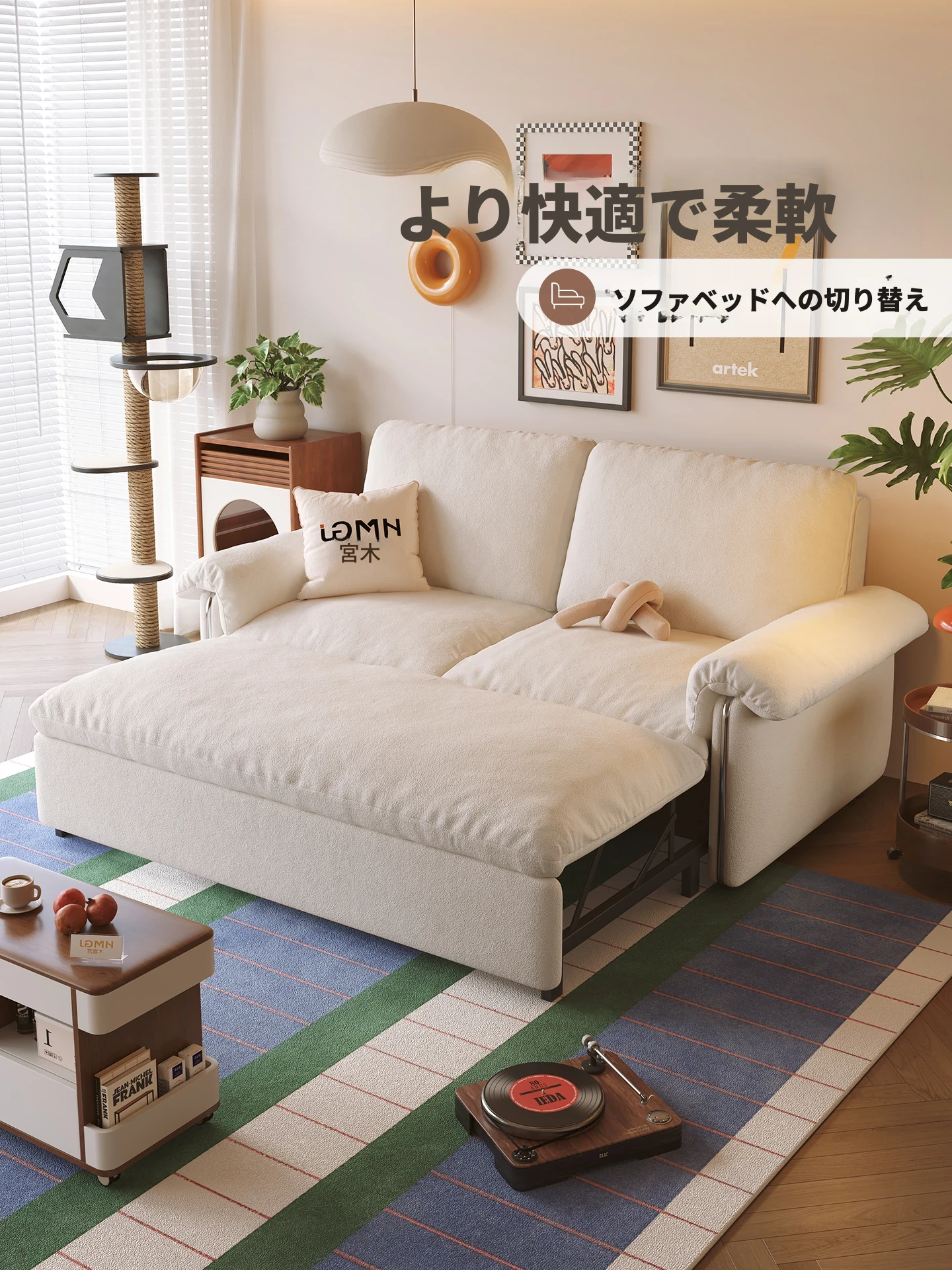 クリーミーな風合いのシフォンソファベッド、小型住宅向けのリビングルームに最適!座り心地抜群で、折りたたみ可能なストレッチデザイン、ふわふわのラムファーで快適にリラックス。豆腐ブロックスタイルでスタイリッシュな空間を演出します!