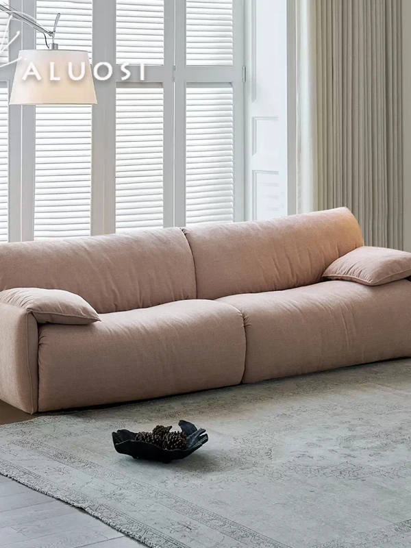 フレンチヴィンテージスタイルのランドソファー|ドバイナクリーム風リビング直線デザイン|デザイナーによる布製ダウンソファーで、あなたの空間に優雅さと快適さをプラス!