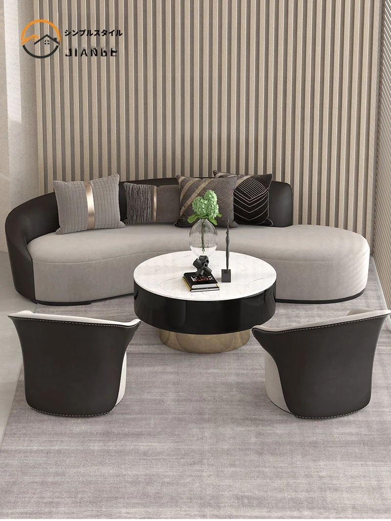 モダンな不動産販売オフィス向けアーチ型レセプションソファー|ラグジュアリーなホテルや美容院に最適なリラックス空間|洽談用テーブル&椅子セットで、スタイリッシュな雰囲気を演出!