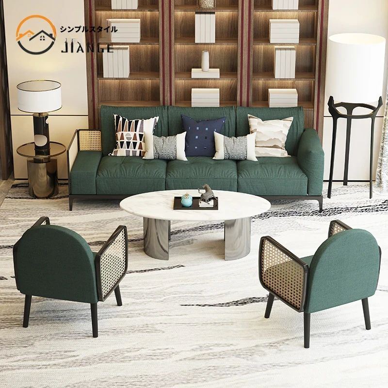 北欧スタイルの高級感溢れる実木とラタン編みソファ - 小型リビングにもぴったりな洗練された布製の接客用カウンター家具。おしゃれな空間を演出!