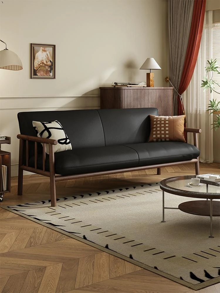 ヴィンテージ風の無垢材ソファー【小型リビング向け】シンプルでおしゃれなブラック合皮製・2〜3人用・直線デザインの完成品!お部屋を引き立てる洗練された一品。