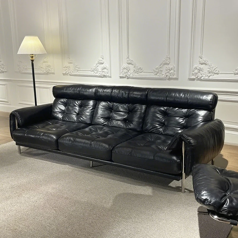 バウハウスオム復古風デザイン本革ソファ - 一流の牛革を使用したミドルサイズの3人掛けリビング用。クラシックな中古風スタイルで、どんなインテリアにもぴったりフィット!