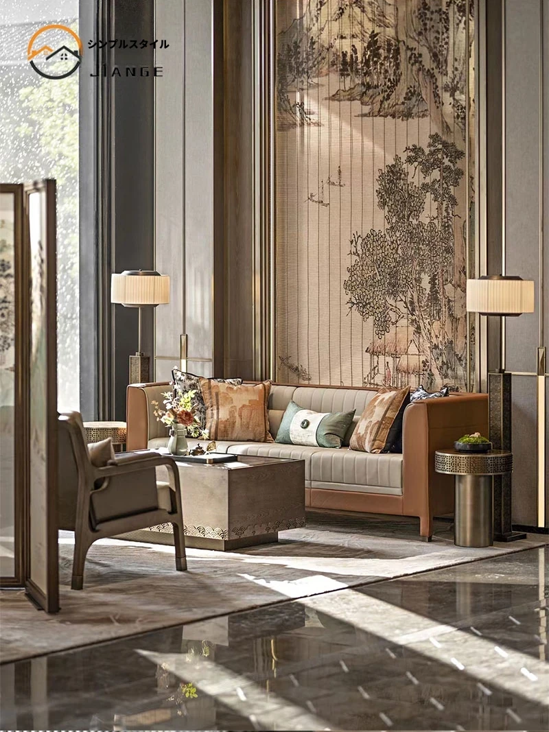新中式スタイルの無垢材カフェテーブルセット|ラグジュアリーなホテルロビーやサロンに最適なモデルルーム用|快適な接客スペースを演出するソファセット