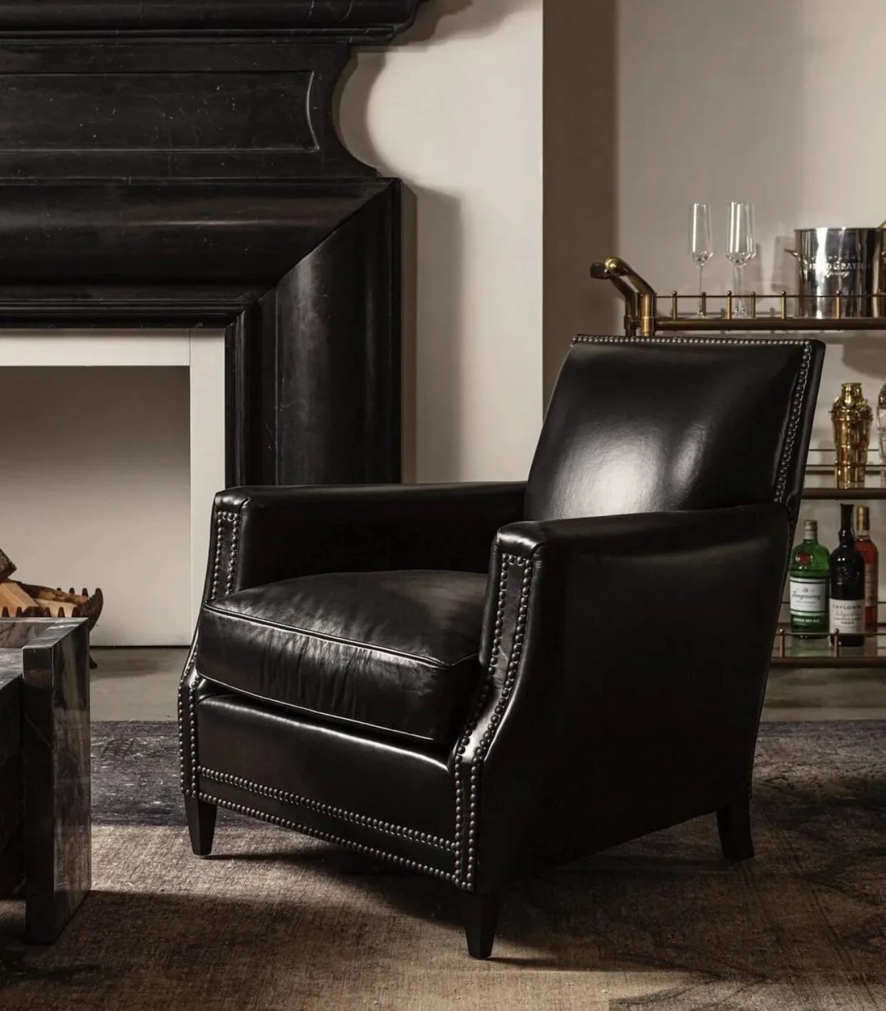 ベルギー製アメリカンカントリースタイルの無垢材オイルワックスレザーリベット付きシングルソファチェア。おしゃれで快適な談話用椅子、あなたの空間にぴったりの家具です。