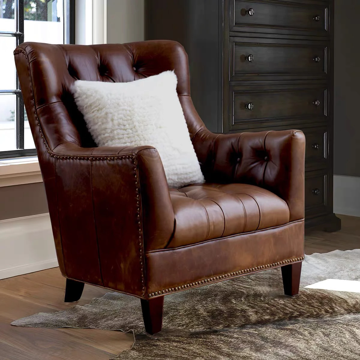 Belgian American Country Style Solid Wood Oil Wax Leather Studded Single Sofa Chair - Perfect for Conversations and Stylish Decor in Any Living Space!